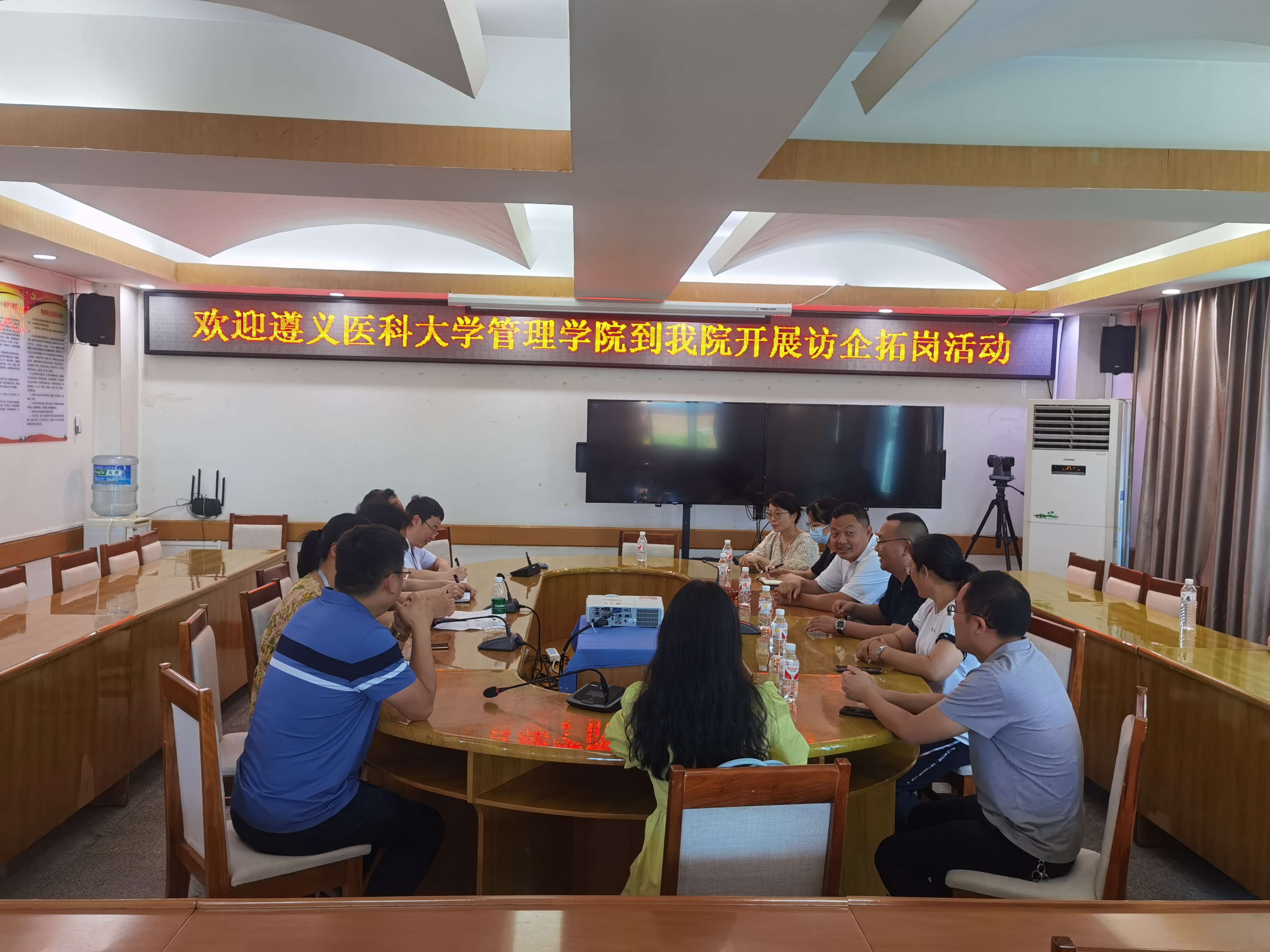 7月13日张文辉书记一行到黔东南州人民医院进行“访企拓岗”走访调研,黔东南州人民医院副院长王万灵,我院校友科教科科长朱捷、办公室主任艾军参加。