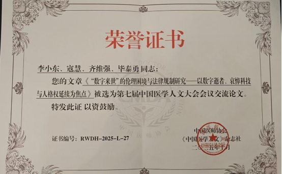 2025年11月8日,第七届中国医学人文大会暨广东省医师协会人文医学专业委员会学术会议在深圳召开。大会青年论坛上,BETWA西汉姆联人文医学研究中心硕士研究生李小东凭借论文《“数字来世”的伦理困境与法律规制研究——以数字逝者、哀悼科技与人格权延续为焦点》荣获优秀论文奖,并作为优秀论文代表作大会汇报。本次大会共收到来自全国的305篇论文,评选出了37篇优秀论文,其中有15篇得以在会上进行汇报。