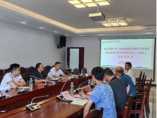 9月11日上午,双方召开联合培养公共事业管理(专升本)交流座谈会,会议由黔南民族医学高等专科学校公共课教学部主任陶晨主持,黔南民族医学高等专科学校党委委员、副校长杨建辉,公共课教学部教师蒋剑,教务科科长佘福强,2024级公共事业管理班辅导员石应基参加座谈会。座谈会上,杨建辉副校长对刘国琴院长一行表示热烈的欢迎,对两校联合培养工作表示肯定。接着,石应基老师和佘福强科长就班级情况与学生管理工作、教学工作管理与运行情况以及存在的困难及解决措施分别进行了详细的汇报。刘国琴院长首先对黔南民族医学高等专科学校对学院人才培养工作的大力支持表示感谢,感谢黔南医专领导和老师们对学生管理、教学工作的认真负责和精心组织。针对联合办学过程中存在的问题,刘国琴院长、彭正员副书记、徐林科长根据工作实际一一进行解答,并表示积极配合黔南医专各项工作开展,及时跟进和解决,推动双方在联合培养公共事业管理专业(专升本)工作中的交流与合作。